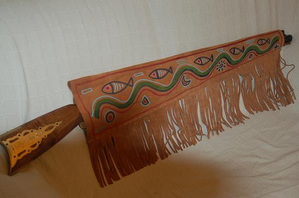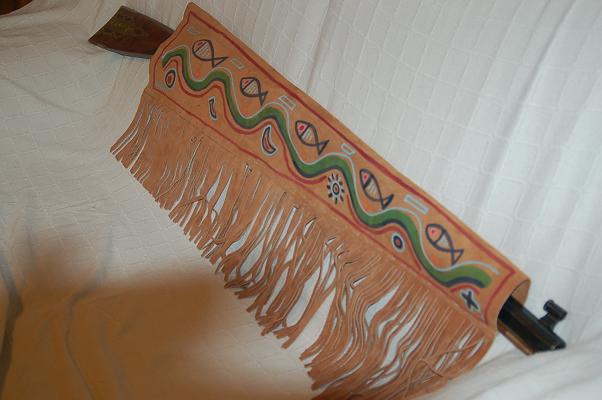 He tomado las medidas, cortado la piel, pintado con anilinas con motivos muy elementales tipo "cherokee", cosido con una aguja gruesa (tras hacer uno a uno los agujeros con un punzón)y cordel de palomar, y finalmente he cortado los flecos (un curro) con el cutter y una regla metálica. Cada lado lo he pintado con motivos diferentes.
