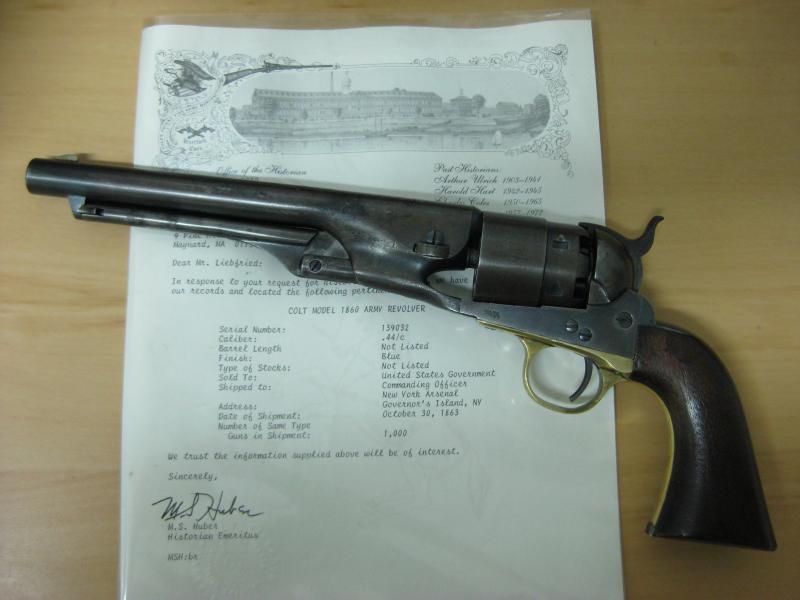 Os muestro mi Colt Army 1860 original de destino militar y fabricado en el año 1863. Muestro con el revólver la carta emitida por el propio fabricante Colt donde expone un poco de su historia referente al destino militar concreto del arma en cuestión durante la guerra de Secesión. Está en estado totalmente original y no ha sido limpiada ni manipulada. Espero que os guste.