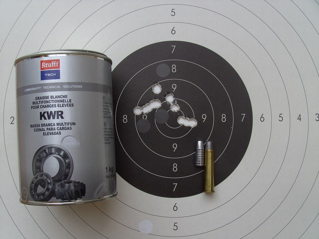 Os pongo la foto del bote de grasa que utilizo en el Sharp junto con la del proyectil (Lyman 480 grains) y el tipo de engarce con la vaina (recalibrada, ligeramente abierta para introducir el proyectil y crimpado posterior con el proyectil comprimiendo la pólvora con taco de carton)