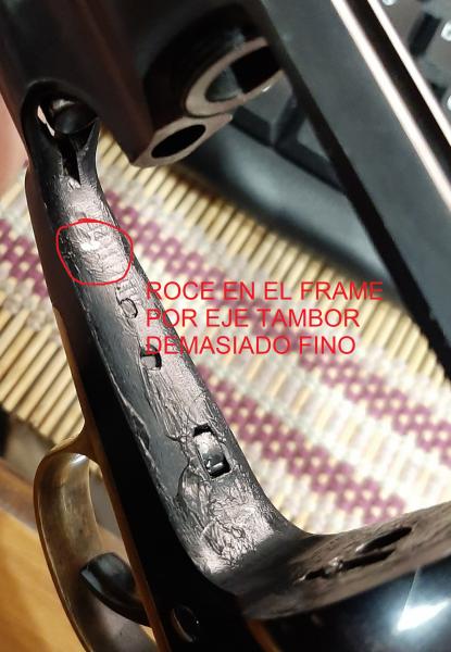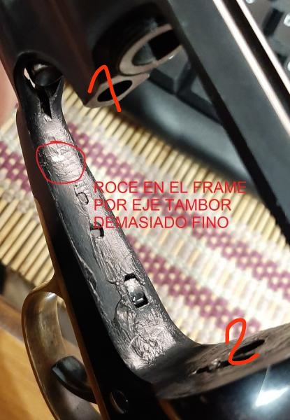 - El eje del tambor tenia un diámetro inferior al especificado (se arreglo sustituyéndolo por uno nuevo), esto producía roces con el frame del revolver y huellas características como las de tu tambor, en especial en los extremos, encontrarás contrahuellas en el frame del revolver, mira mis fotos.