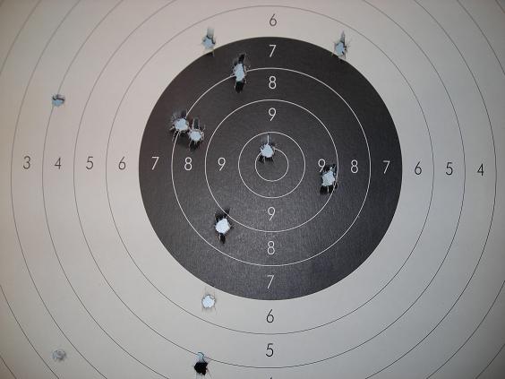 Olvidate de tocar las miras (y menos el alza, que el punto de mira si te pasas se puede cambiar pero el alza ya es algo más jodido de arreglar). De todos modos con esa dispersión no se tocan miras. Primero es mejor lograr una buena agrupación de los impactos apuntando siempre a pie de blanco (te ha de importar una mi.. a donde vayan los tiros) y una vez lograda ya se tocara lo que haya que tocar. Ten en cuenta que para lograr una buena agrupación hay que jugar mucho con las cargas y las bolas, una cosa de cada vez y mínimo un par de tambores (no uno o dos tiros, que no vale para nada) veras que la agrupación y la zona de impacto varían y como no cuando pruebes otro tipo de carga limpia el cañon y las camaras (una varilla de 10 milimetros de diametro y un cacho balerina o similar empapado en glassex hacen milagros, lo secas con otro pedazo de balerina y listo).