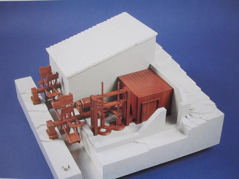 Estos son los planos de otros molinos de pólvora, se puede ver el artificio. Abajo, una maqueta