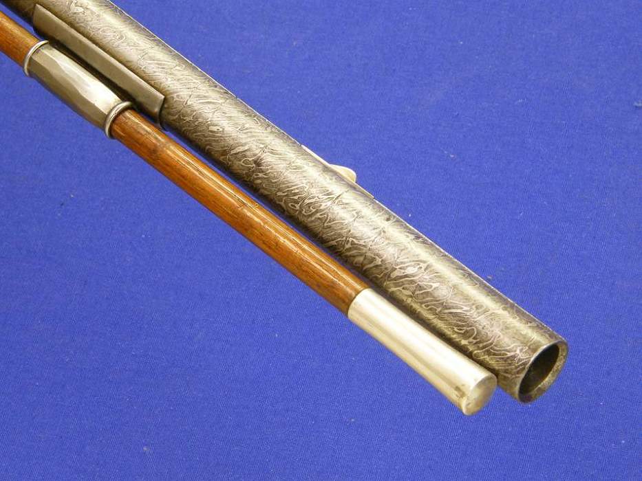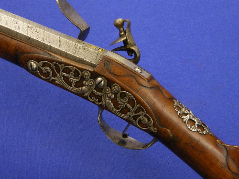 A very nice Austrian Flintlock Gun by FELIX MEIER IN WIENN, with silver mounts and a Turkisch barrel, circa 1720, cal 16 mm, length 145 cm, in mint condition