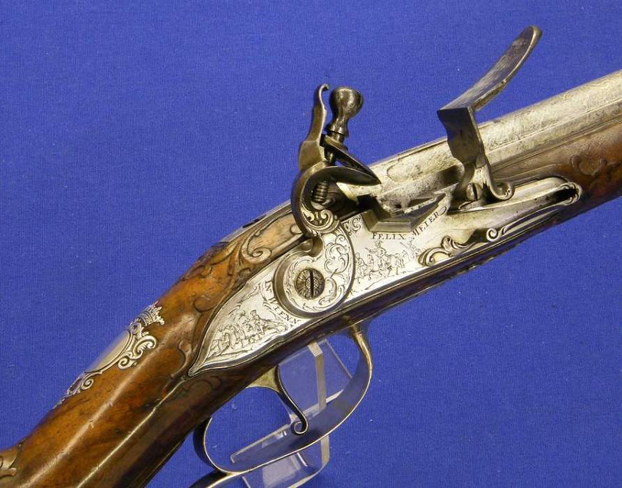 Un bello fusil austriaco de llave de silex por FELIX MEIER de Viena con aparejos de plata y cañon turco, sobre 1720 en calibre de 16 mm. y una envergadura de 145 cm.