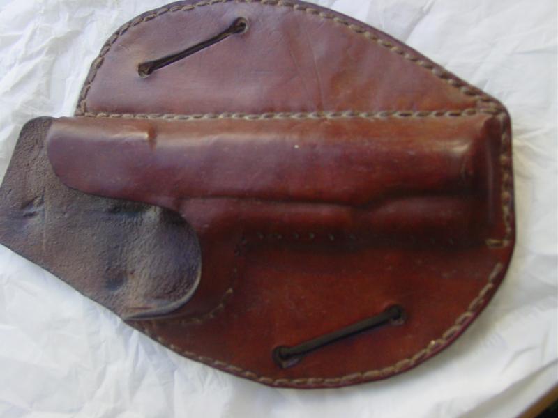 Adjunto una funda "de tortilla" que fabriqué hace años, cuando practicaba lo que entonces se llamaba "tiro instintivo". Era muy importante que fuese como un guante porque como ves no lleva ningun tipo de cierre. Puesta en la cintura, en posición erguida, "muerde" el arma y la mantiene perfectamente encajada en la funda, pero basta que te inclines un poco (primer tiempo de la posicion de alerta) para que se abra y permite empuñar y extraer con toda suavidad.