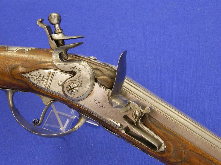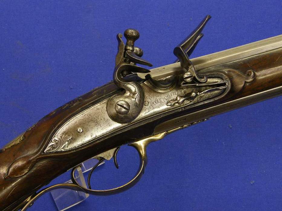 Este arma de doble cañon, superpuestos, de origen holandes, con llave doble de silex y aparejos en plata por le señor J.G. Ertell de Amsterdam es del siglo XVIII y esta en unas condiciones ideales.