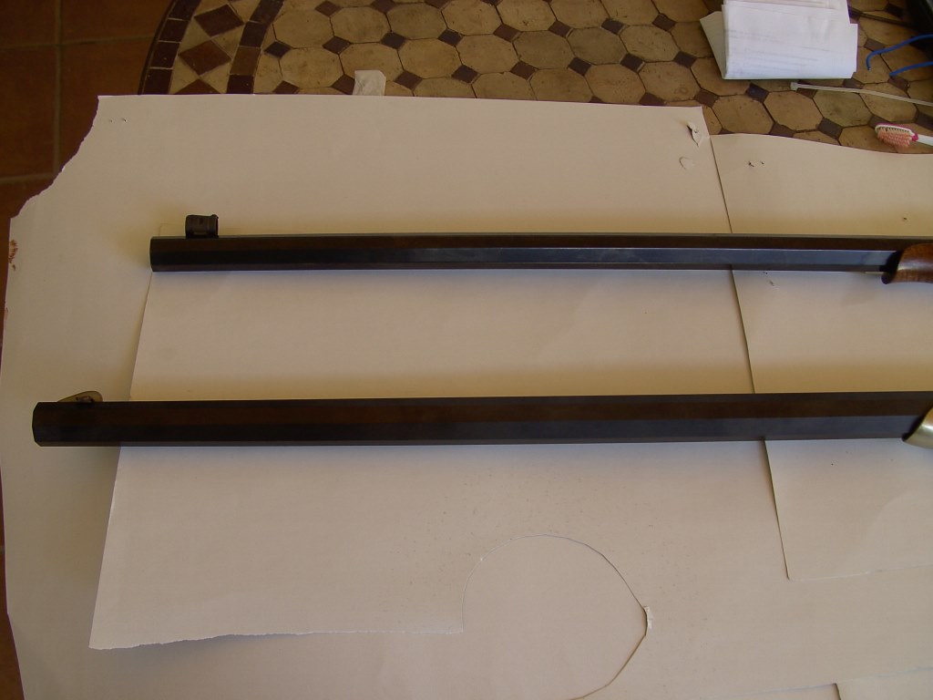 Como puede verse en las fotos, el cañon del modelo de Izquierdo es aparte de unos centímetros más largo, bastante mas grueso. De hecho la diferencia de peso de un arma a otra es de un kilo (4,85-5,85) por lo que ahora el peso del Sharp es igual o bastante similar al del Gibs.