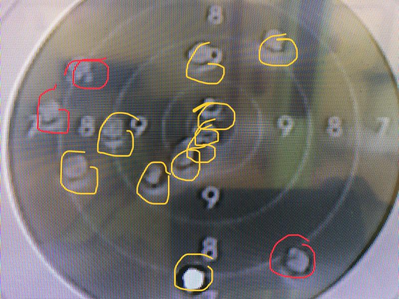 En la foto, mala como siempre ya que es sobre pantalla y blanco de papel plástico que rompe a su bola, se ven marcados en amarillo los impactos de la primera tanda sin sémola (hay hasta dos casi ceros abajo) y los de sémola incorporada marcados en rojo... al menos tengo buen feeling para cuando vuelva a probar la semana que viene