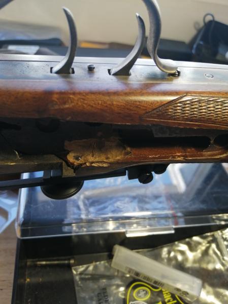Se han repetido fotos y han salido en el orden que le han salido de los cojones. En fin, que a pesar de que derpues de limar interiormente la madera para que el muelle no roce, la cosa mejoró pero el martillo sigue frenandose a 2-3 milímetros antes de meter el percutor a tope. Hay otro freno más. La horquilla del muelle real da en el armazón de hierro.