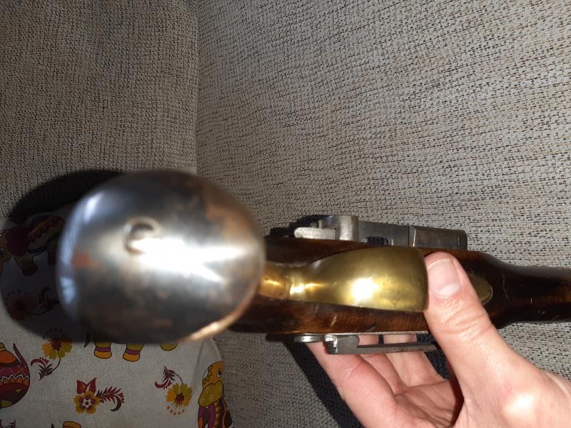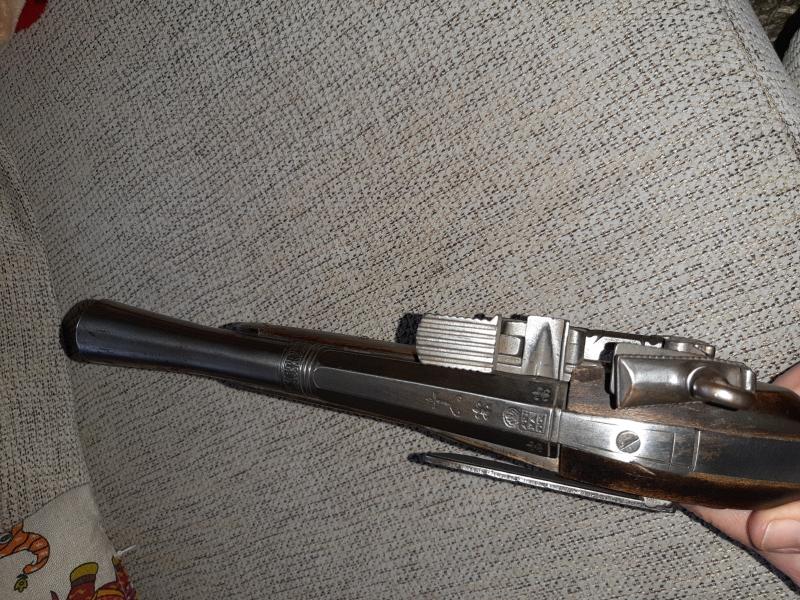 Hola. A ver si algún compañero puede ayudarme a identificar esta pistola de chispa. Creo que puede ser reproducción por lo que me comento su antigua dueña que me comento que fueron regalo a su suegro en una visita a la fábrica de Santa Barbara (luego pondré fotos de la otra) más un catálogo. El oído comunica con el cañón, el martillo tiene posición de seguro y disparo,no es calamina y sin marcajes modernos. Si alguien puede decirme algo se lo agradecería.