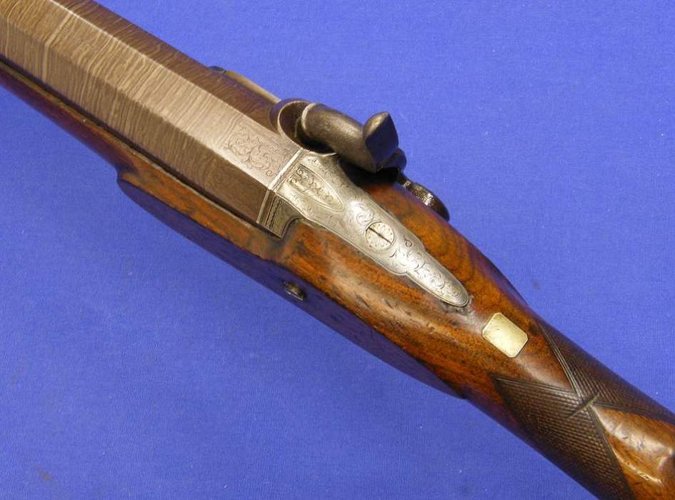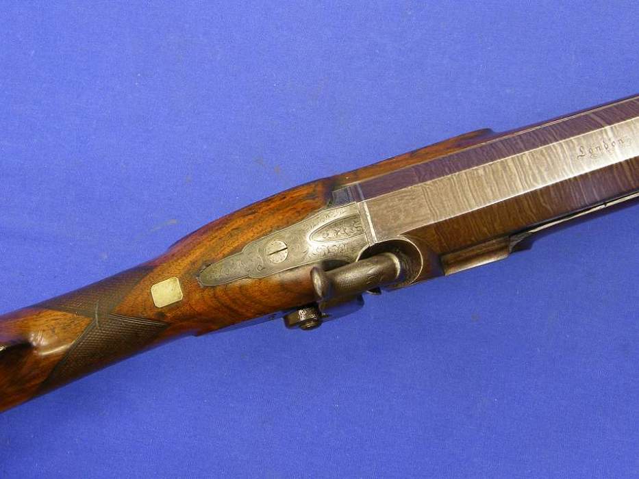 Este deportivo y muy pesado fusil ingles de anima lisa tiene el calibre de 19 mm. y un largo de 150 cm. en perfectas condiciones. Tiene en el cañon, parte superior, la incripcion London y en la parte inferior, las marcas del banco de pruebas de Birmingham, I.W. y tambien TWISTED.