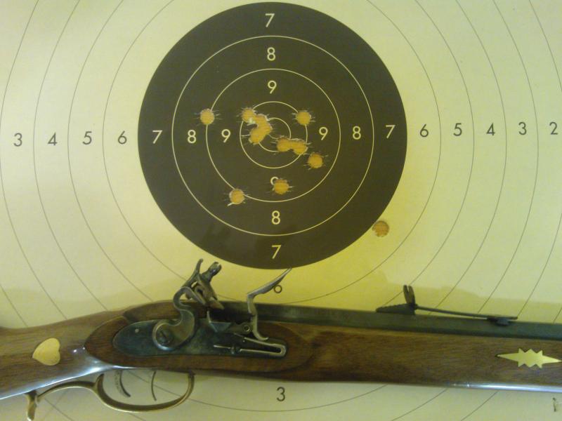 Hoy me he estrenado con el Jäger de pedernal al hombro.Despues de unos dias probando cargas y piedras apoyado parecia que el rifle estaba puesto a tiro asi que tocaba dar el salto.La carga final 45gr de 3fff y 18gr de sémola de trigo.Los primeros tiros un fracaso total incluyendo uno fuera del cartón.La ansiedad del principiante y un par de retardos no presagiaban una buena mañana.He templado un poco los nervios y he hecho las cosas con un poco mas de calma y todo ha empezado a salir bien.Los tiros han comenzado a salir casi tan rápidos como con pistón y al mejorar la parada,mucho mas critica que con percusión,han llegado los primeros tiros buenos.Dos dieces al final me han resarcido de los primeros petardazos.