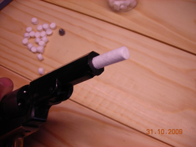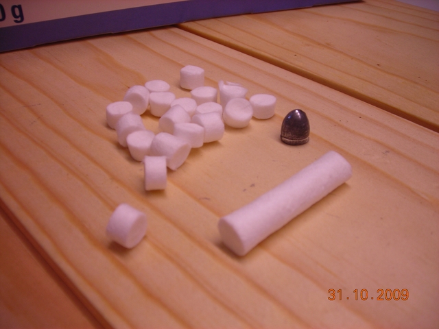 En esta páguina podeis encontrar unos rollitos de algodón prensado de los que utilizan los dentistas que cortándolos a medida son unos prácticos tacos para revólver o pistola, la caja os sale a unos 6 euros y salen unos 1.800 tacos sin mucho esfuerzo