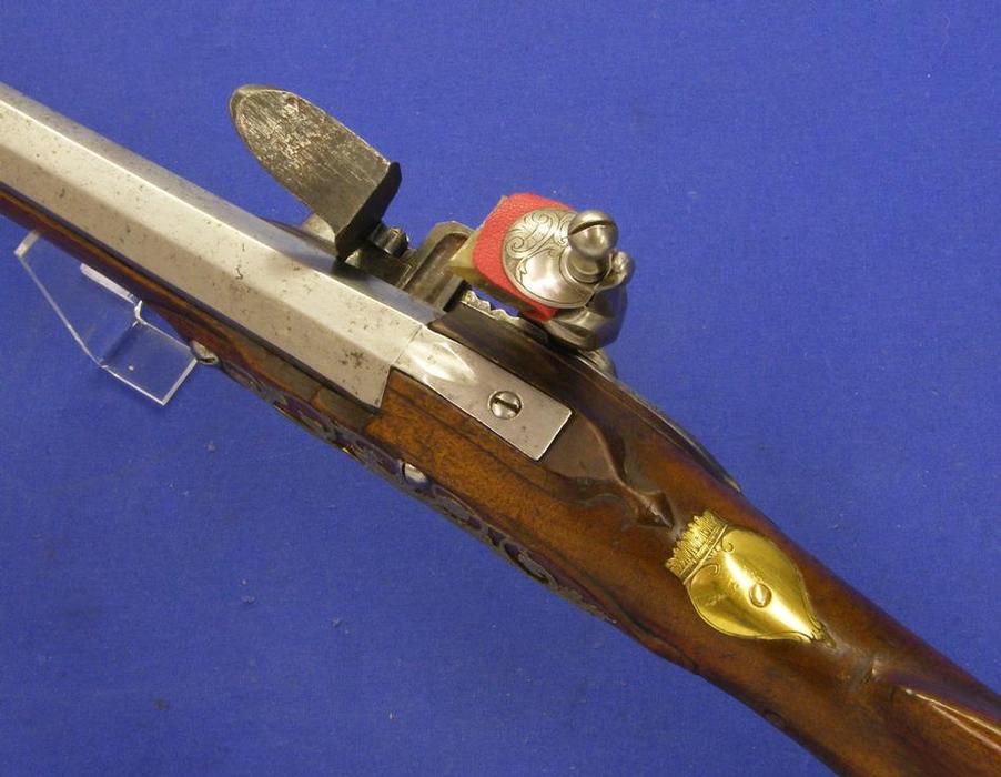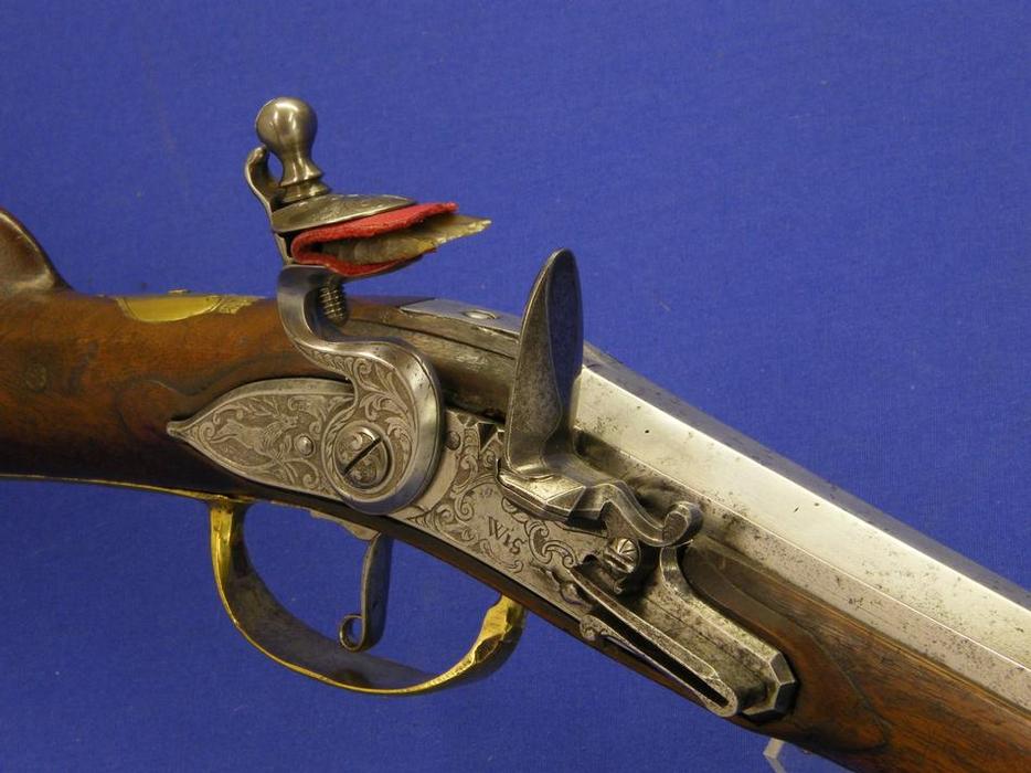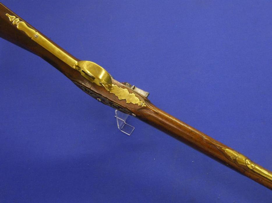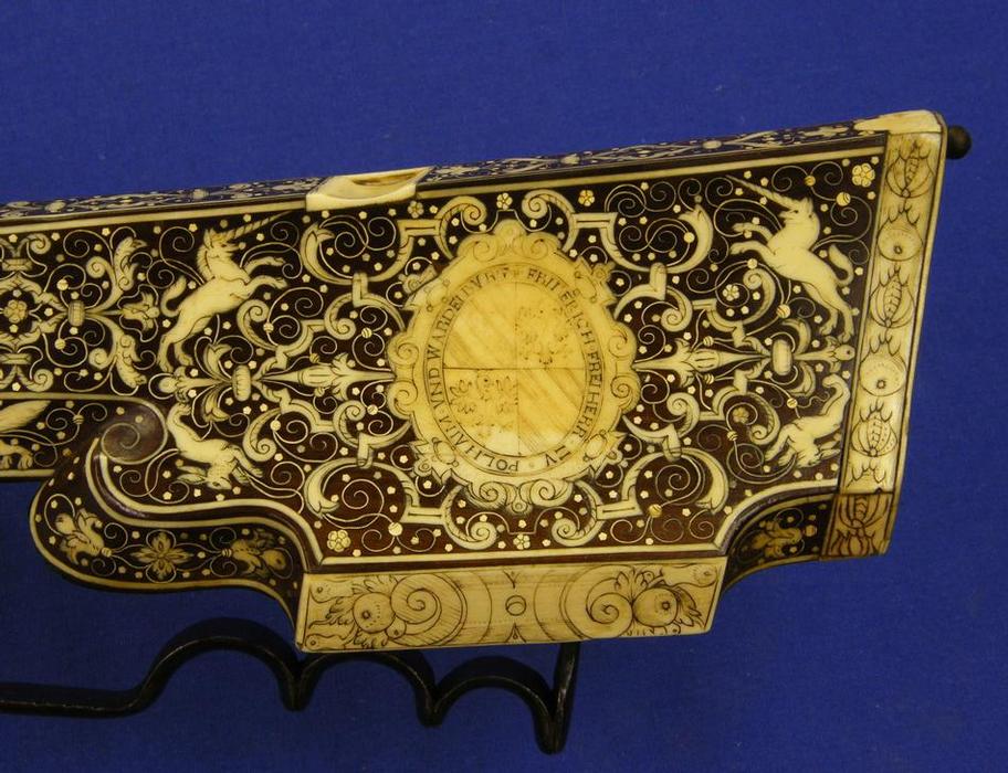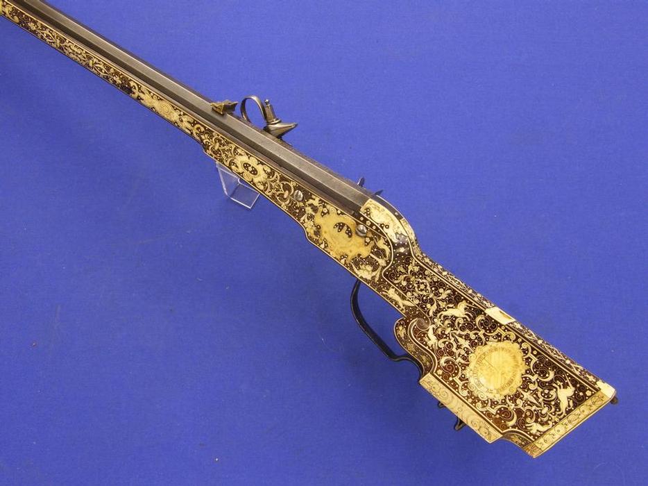 Un soberbio rifle austriaco del siglo XVII por Joseph Hamerl en Viena, tiene una longitud de 120 cm. en impecable estado. Toda la madera esta finamente incrustada en hueso (creo, aunque pudiera ser marfil) y tiene un escudo de armas en la culata con la leyenda "FRIEDERICH FREIHER ZU POLHEIM UND WARDENBURG".