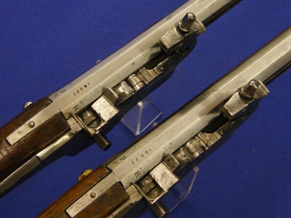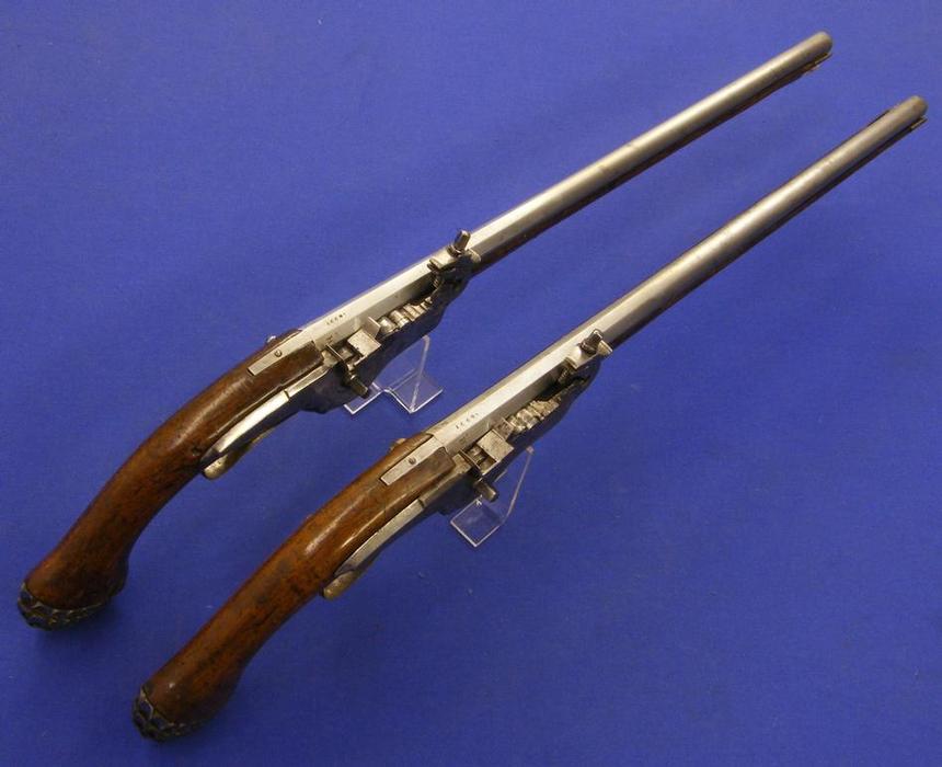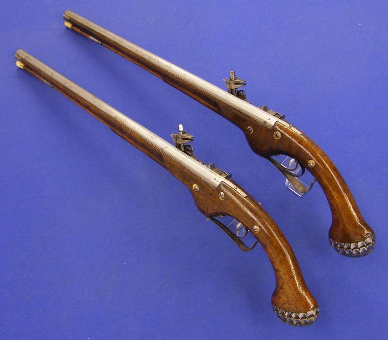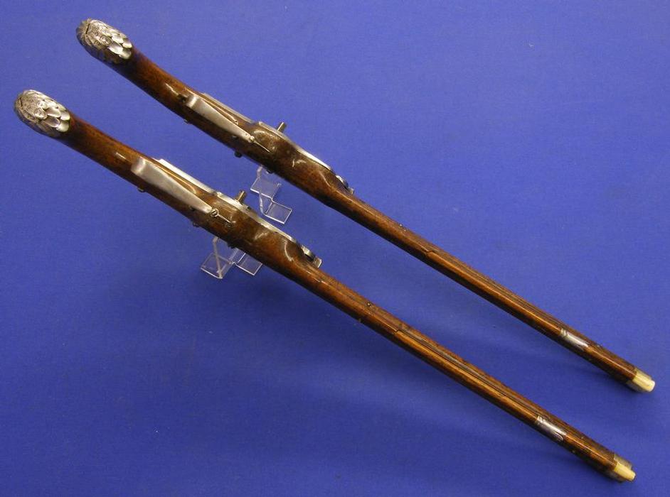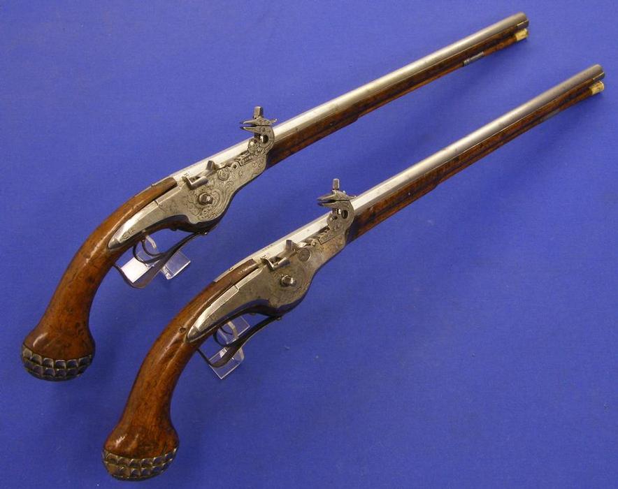 Pareja de preciosas pistolas de llave de rueda de posible origen austriaco, con marcas de fabricante P H y datada en 1.660 (casi nada) largo 68 cm.