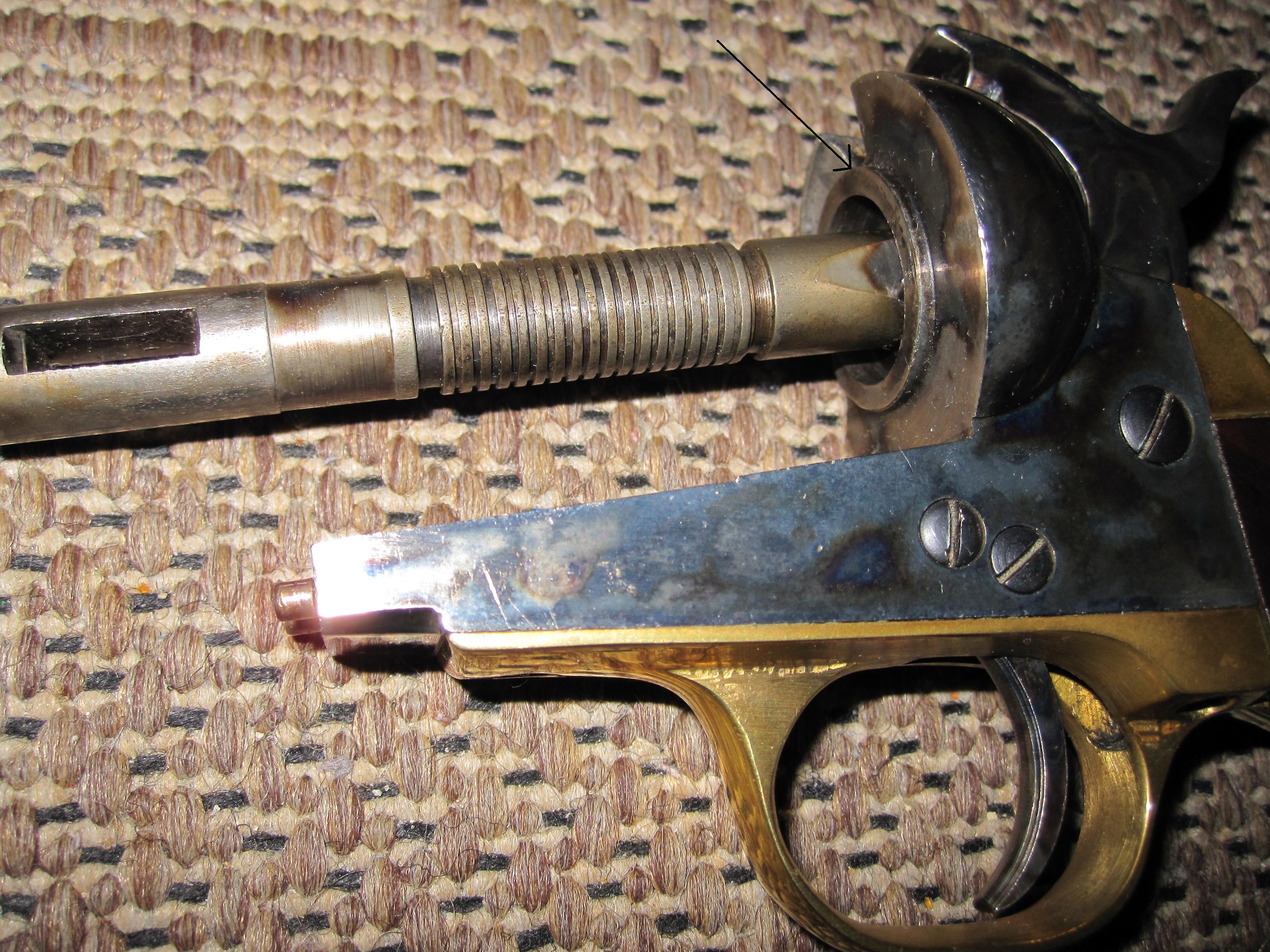 Como se puede ver en las fotografías, cuando digo que la chimenea está encastrada me refiero a que hay espacio de seguridad para que no percuta el pistón aun saliéndose, y que está bien protegida del fuego por el propio cilindro. Pero es que además el Colt tiene el tope mencionado que impide que el cilindro toque al armazón, si se sale el pistón (no se sale porque le das un “pellizco”, eso sí lo sabía) no llega a percutir porque no se traba entre el cilindro y el armazón, (otra cosa son los restos de pistón ya estallado). De todas formas, no es el caso pues, insisto, mis pistones estaban en su sitio.
