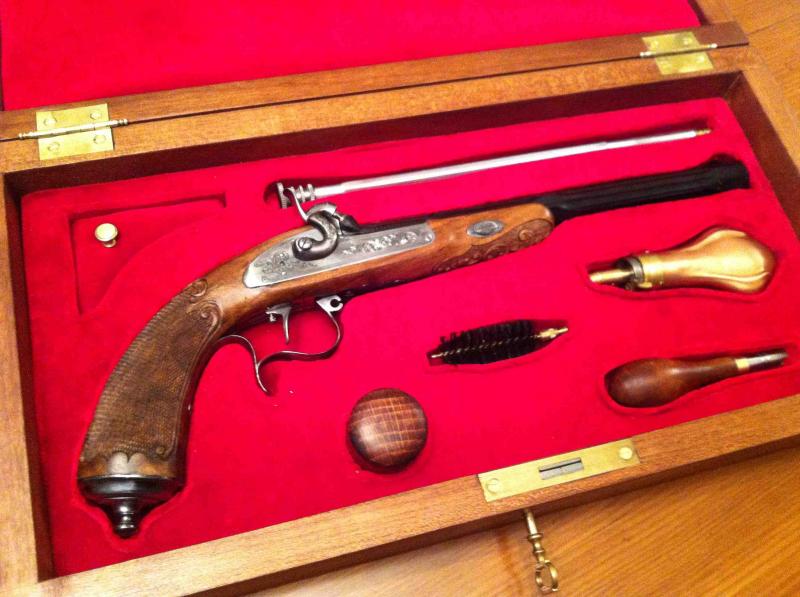 Pistola de duelo Gastinne Renette (fabricada por ARSA, ésta en su versión lujo con incrustaciones de oro y grabados en madera a mano).