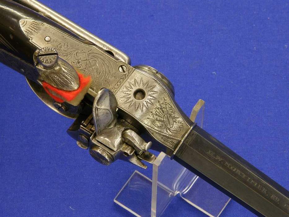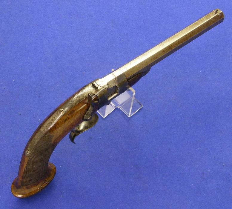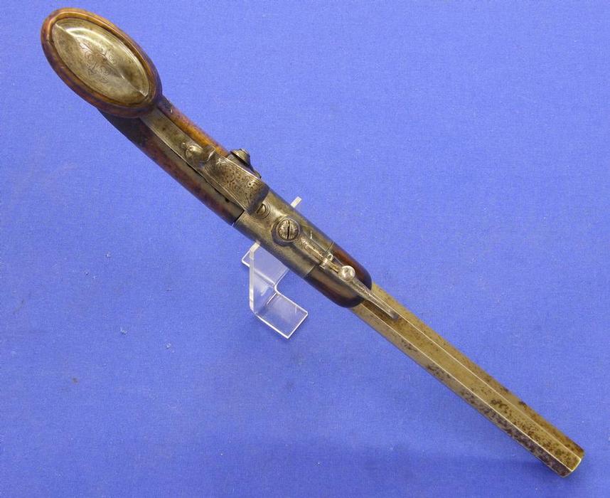 Bonita pistola de silex multi-disparo con sistema Lorenzoni por H.W.MORTIMER LONDON, sobre 1800, calibre 12 mm. longitud 44 cm. en condicion ideal.