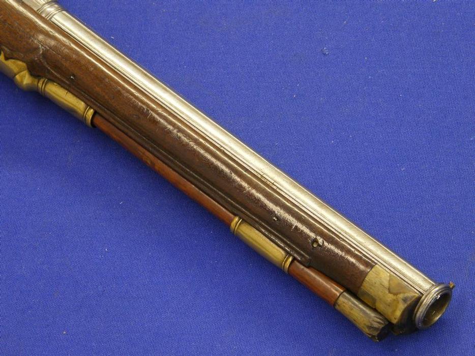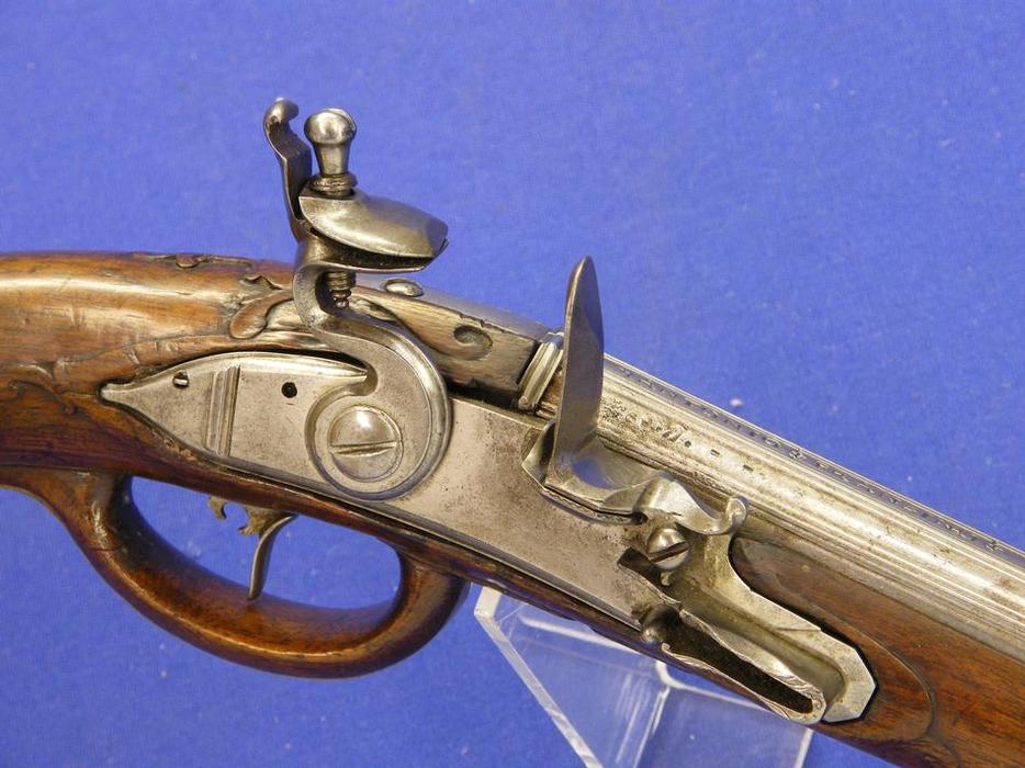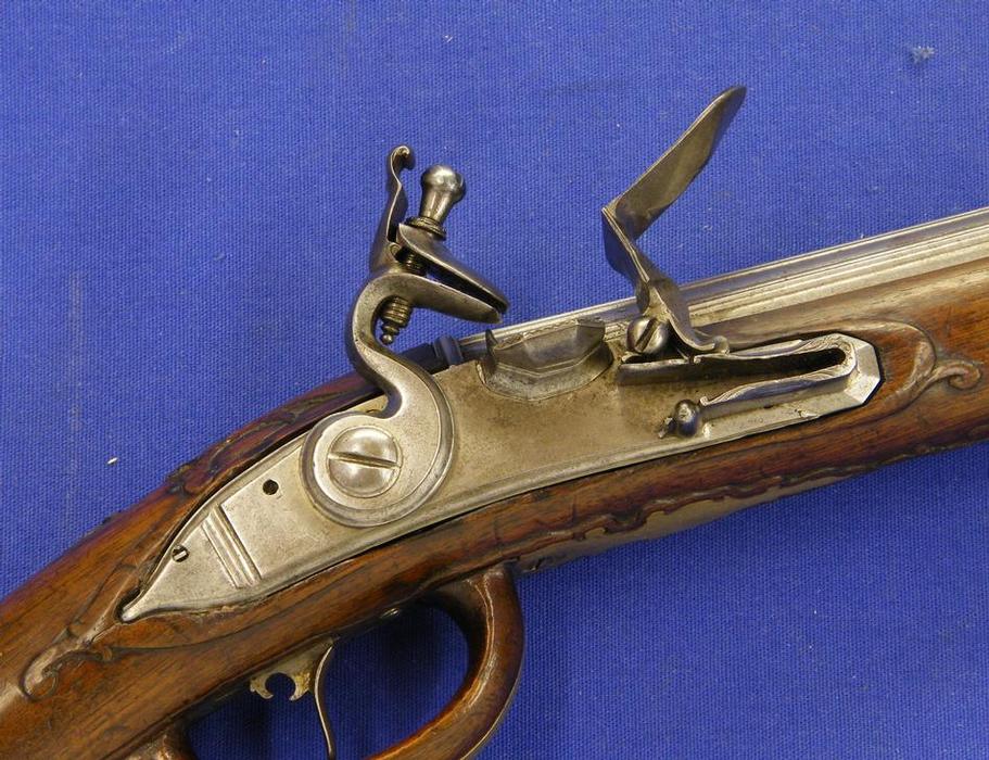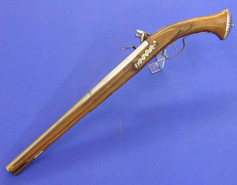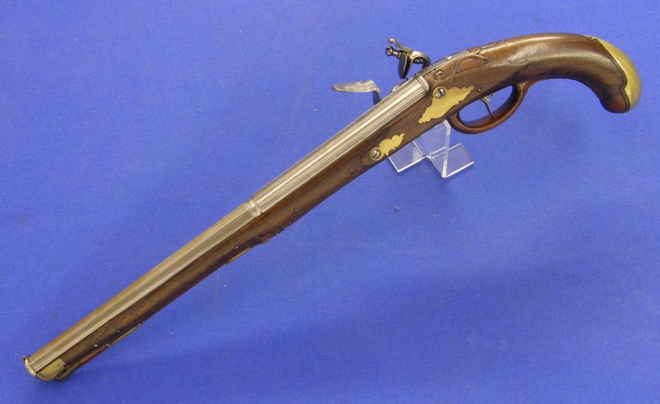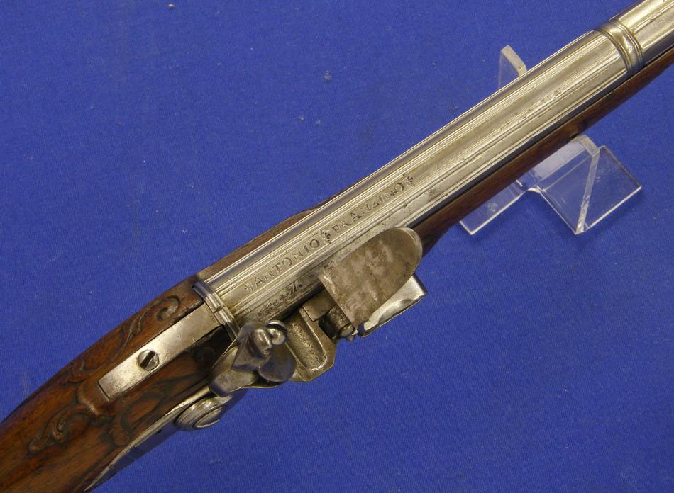 Pistola alemana de chispa del siglo XVIII con cañon italiano por Antonio Francesco, calibre 14 mm. longitud 50 cm, en estado ideal.