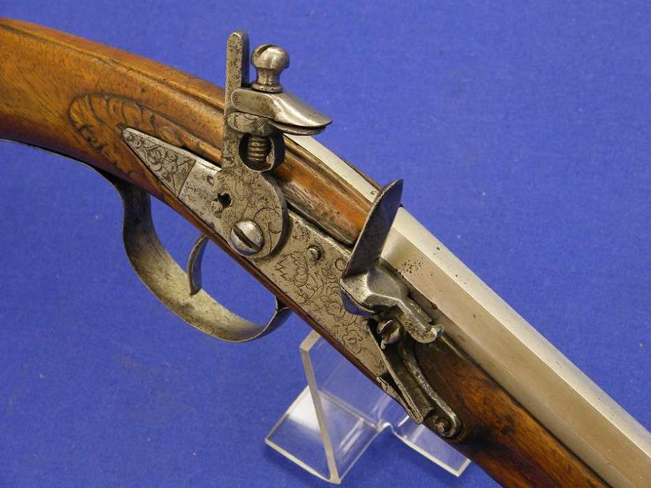 A very scarce Italian Percussion Pistol with a breechloading System Marelli, signed AGOSTINO MARELLI A MILANO, caliber 11 mm, length 40 cm, in mint condition