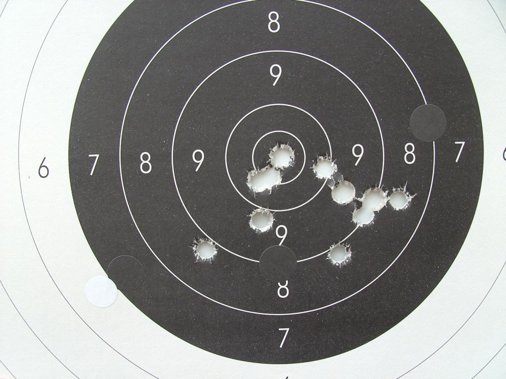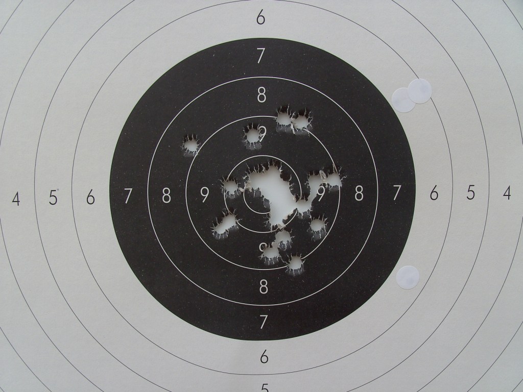 En el segundo disparo ya estaba en el 10 y con un fallo leído en el momento del disparo que se ha ido al 8 a las 10, varios dieces seguidos y nueves pegados al diez, hasta el octavo disparo donde han empezado a salir disparos a la raya del nueve sin que los hubiera leído en el disparo. La racha mala ha durado cinco disparos que todos me parecían buenos y se iban a un lado y a otro lejos del diez. Me he puesto a pensar que pasaba y he repasado todo el proceso como si no hubiera disparos anteriores y han vuelto los dieces y los casi dieces...........¿cual era el fallo?, creo que la posición de la cara que se había retrasado posiblemente por comodidad.