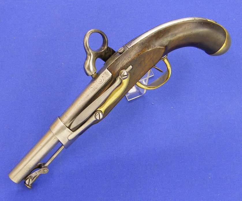 Un escaso ejemplar de pistola de marina holandesa modelo 1818 con gancho de cinturon y anclas cruzadas sobre el cañon, en muy buen estado.