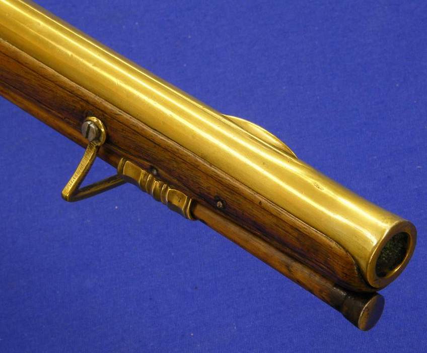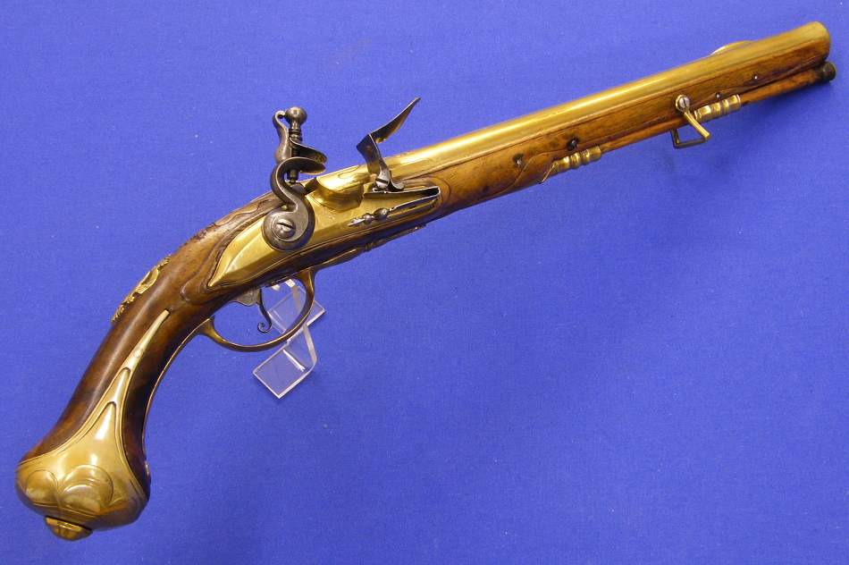 Bonita pistola holandesa de silex con la platina de la llave y el cañon en laton cincelado , firmado BECKERS A MAESTRICH, en el guardamontes el numero 3, (lo que indica que pertenecia a un juego de varias piezas, n. de super) en muy buen estado y calibre 15 mm y largo 53 cm.