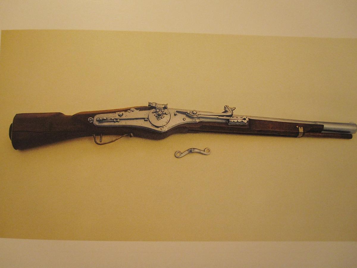 Continuamos con los elementos de puntería, con un alza tubular o de "tunel" que actua como un diopter y que permite colimar con el punto de mira. Sin duda este dispositivo, común a partir de entonces, es un mecanismo avanzado para la época y da una idea de la precisión que se pudo conseguir con este tipo de arma.