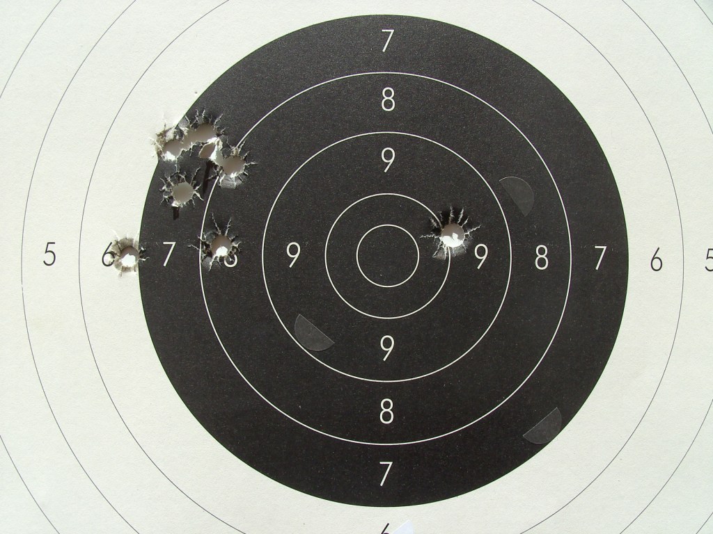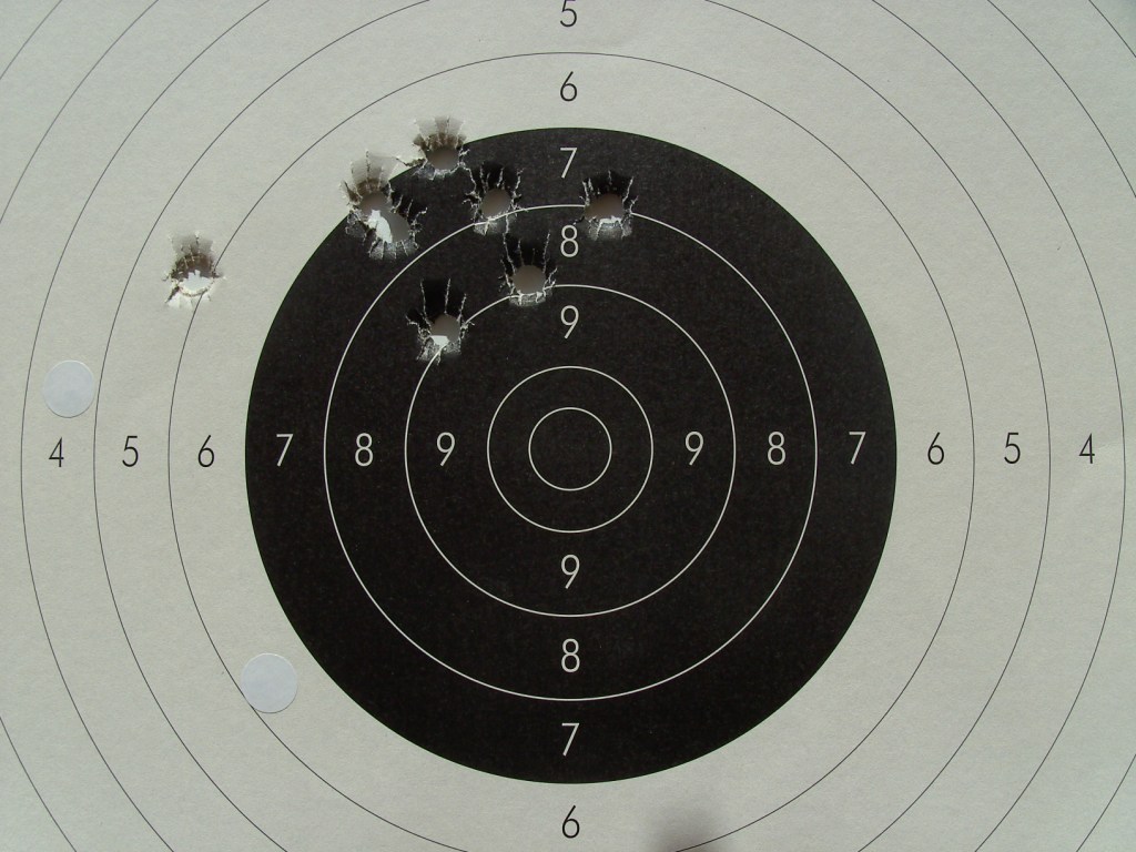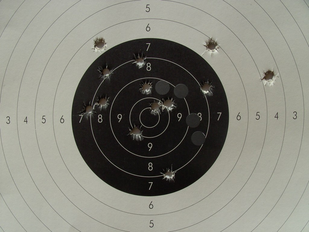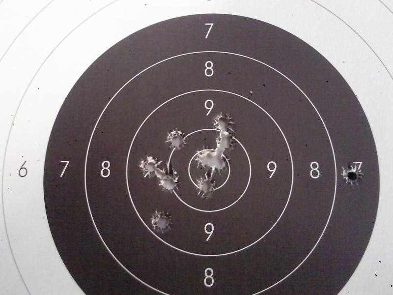 El primer disparo, como es habitual en minié se ha ido a un sitio distinto al resto (es el impacto de la izquierda)