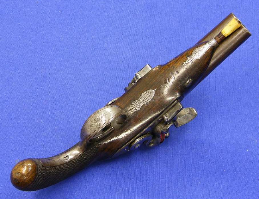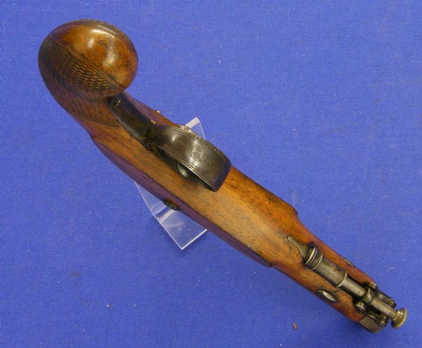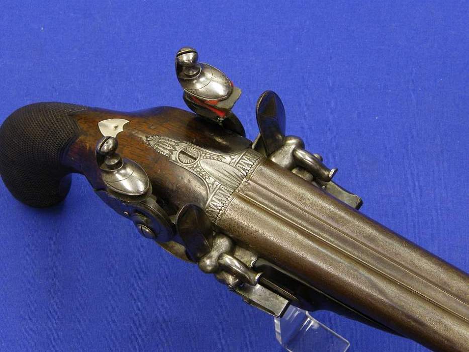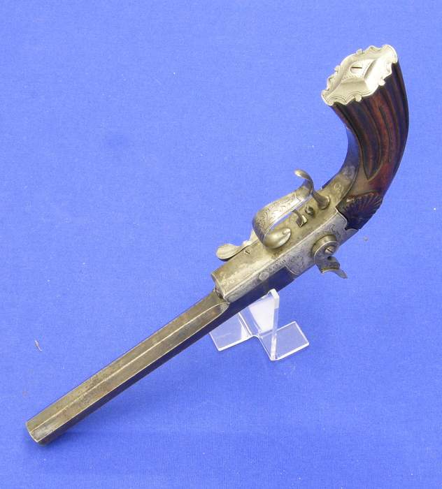 Preciosa pistola inglesa de dos cañones y llaves de chispa por Hulbert (Screwsbury) calibre de 15 mm, longitud 31 cm. en muy buen estado.