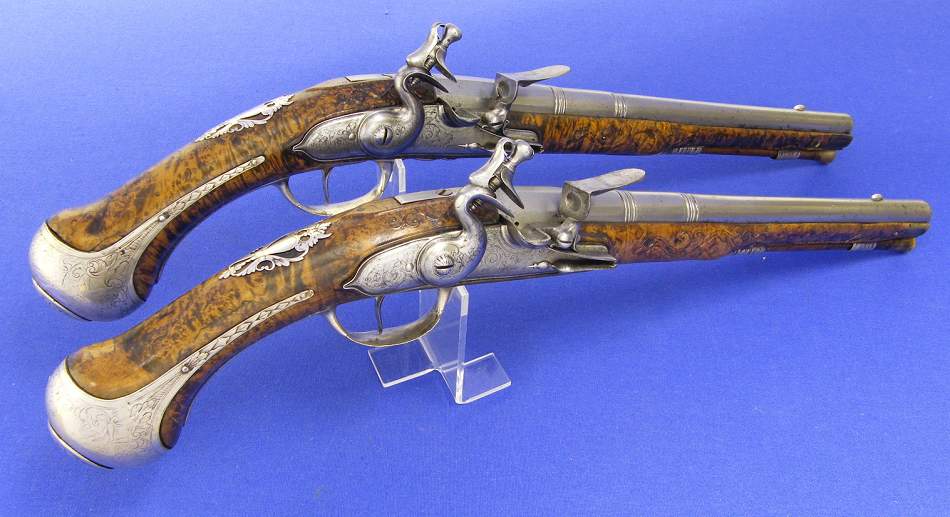 A very nice pair of 17th century silver mounted Liege pistols by Detriche, in mint condition .
