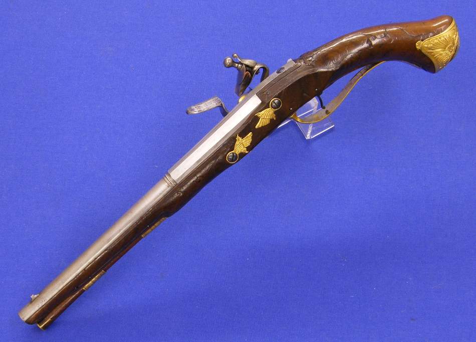 Bella pistola francesa de chispa por Jean Gourgouliat (St.Etienne) sobre 1720, calibre 14.5 mm, longitud 52 cm, en muy buen estado.