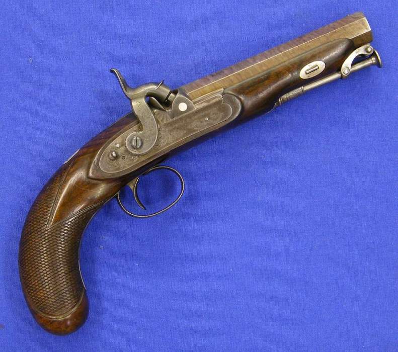 Un preciosa pistola inglesa de percusion por Westley Richars, en el 170 de New Bondstreet Londres, calibre 14 mm. Longitud 26 cm. En perfecto estado.