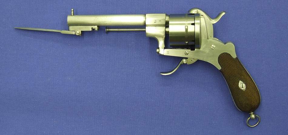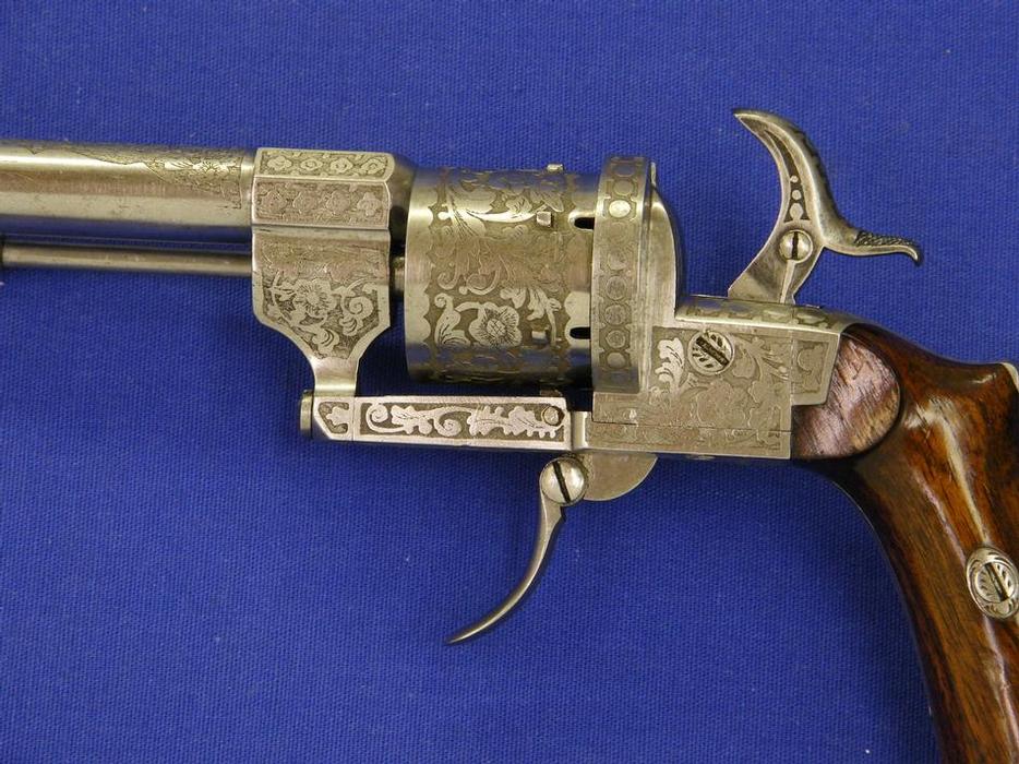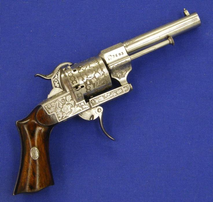 Bonito revolver frances sitema pinfire firmado por E. Lefaucheux en Paris, triple accion 7 mm. longitud 21 cm. patente 1.862, finamente adornado el armazon y en perfecto estado.