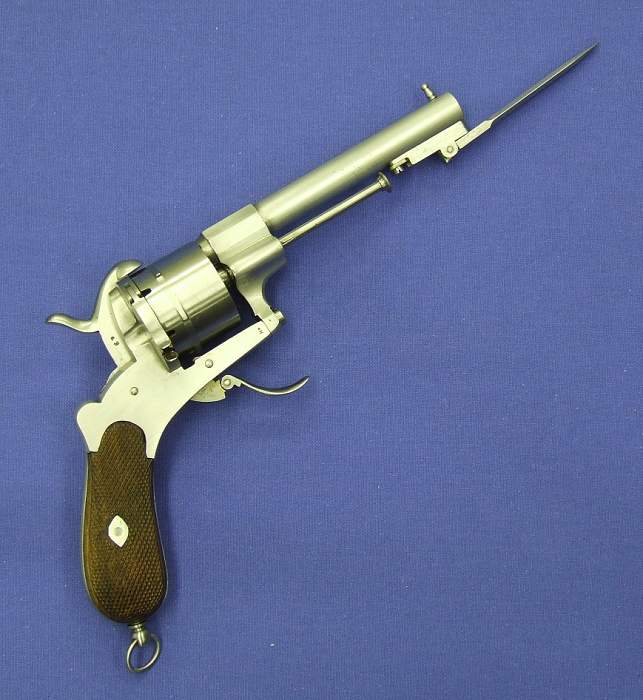 A very scarce Dutch pinfire revolver with bayonet, signed P.STEVENS (Maastricht), and marked with crowned AF (August Francotte Liege), in mint condition, kal 11 mm, lenght 27 cm. Price 1.550 euro