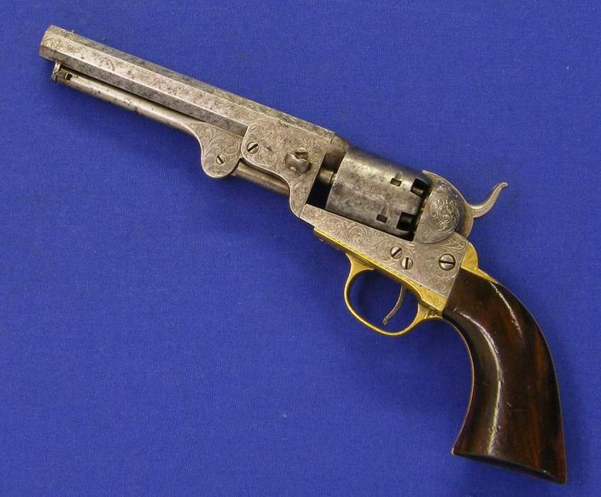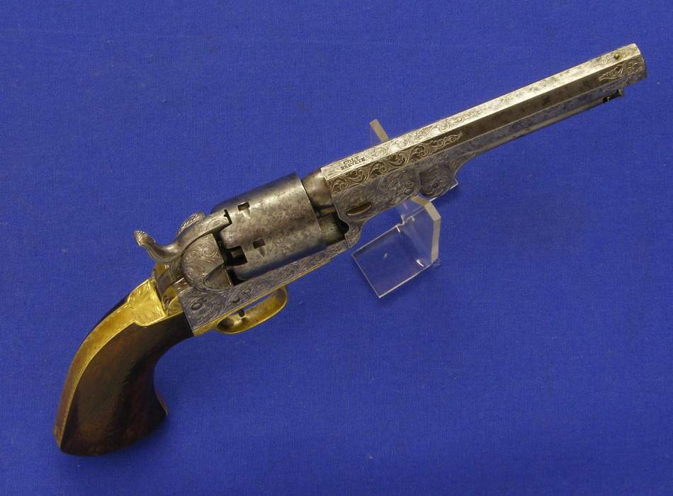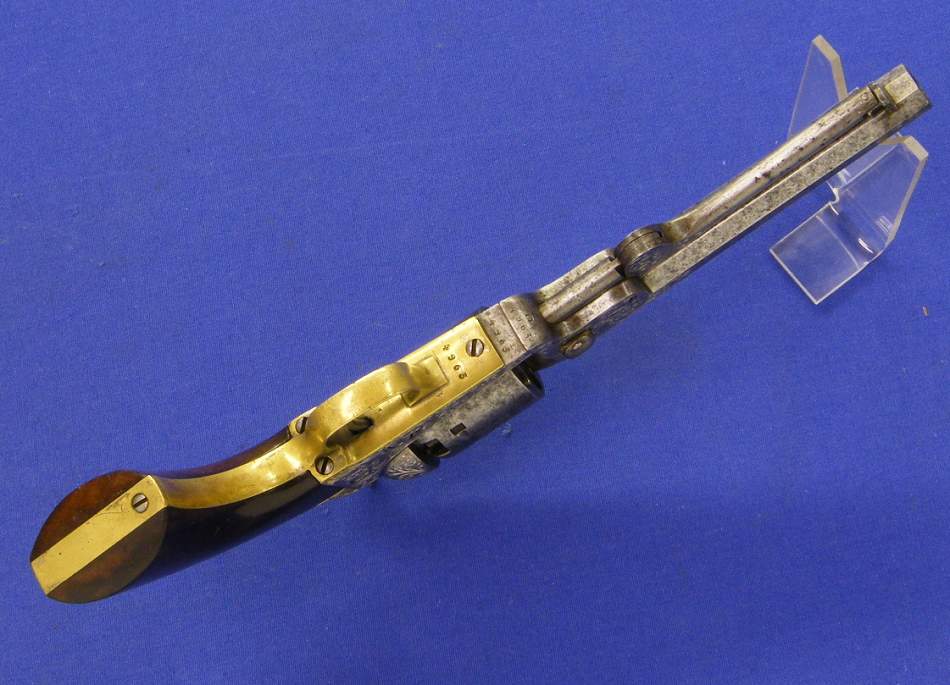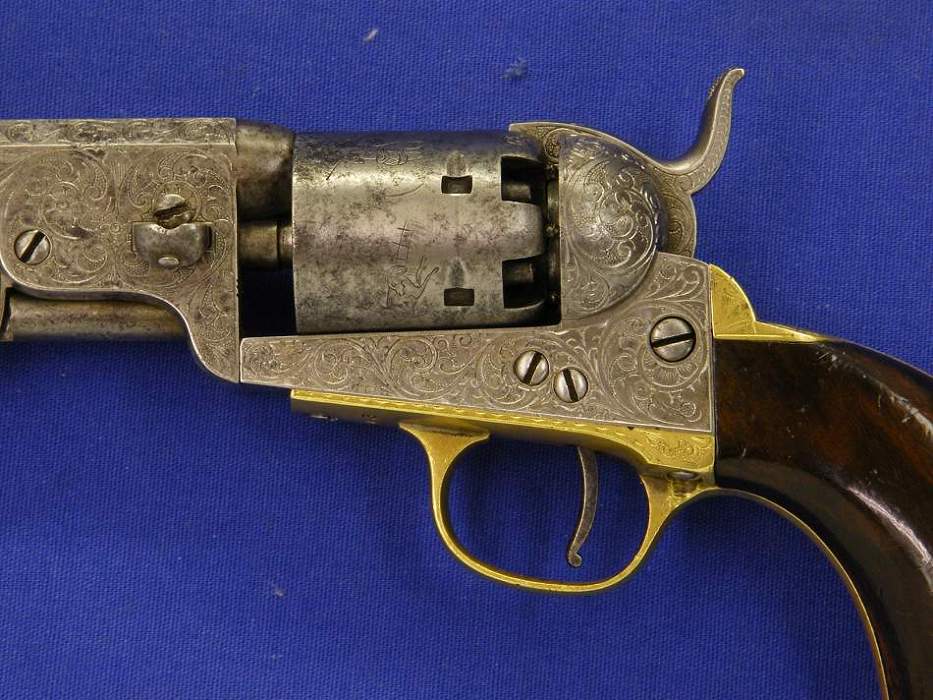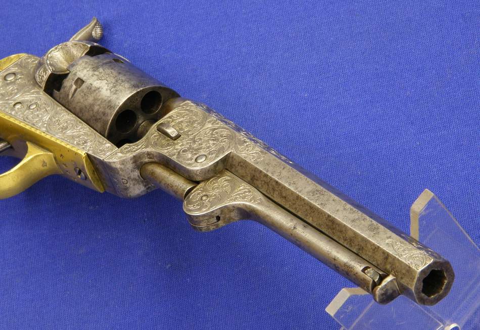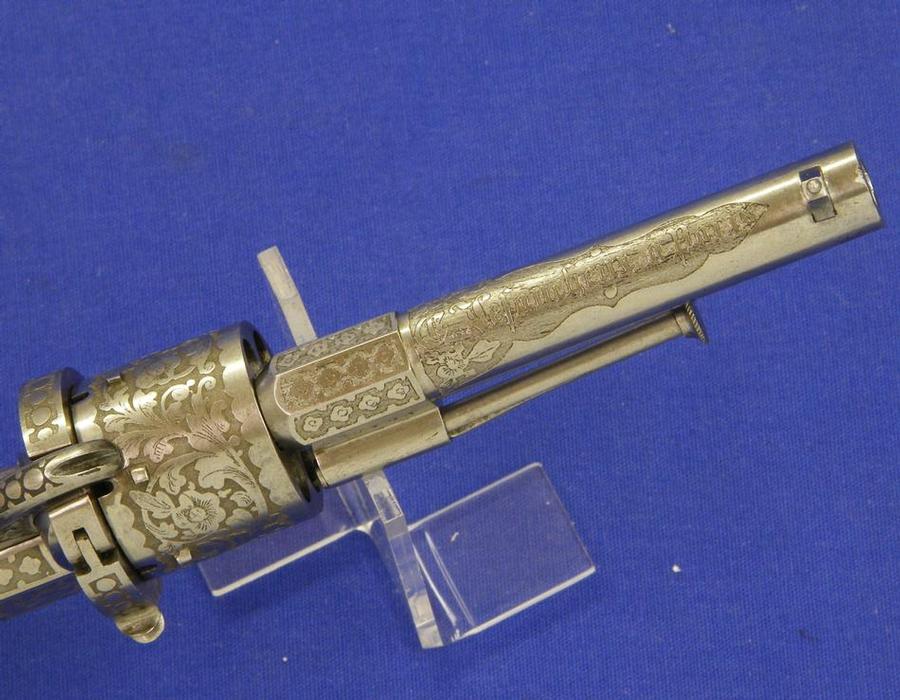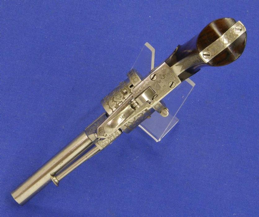 Precioso y escaso revolver de percusion belga bellamente gravado. Se trata de un Colt Pocket calibre 7 mm. Longitud 28 cm. Sobre el cañon “COLT BREVETE” en perfecto estado.