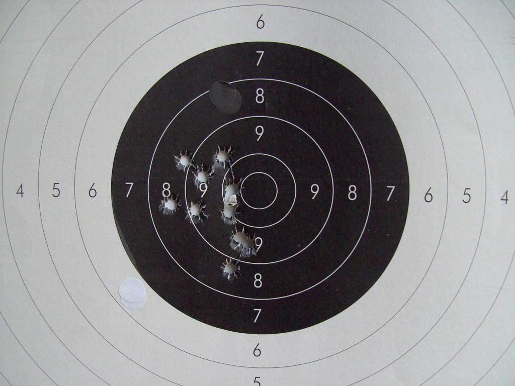 No es una mala agrupación para 100mts, de estar centrada serían 98-99 puntos, ¡ahí es nada! solo quedarían fuera los tiros bajos y el 8 más alejado...