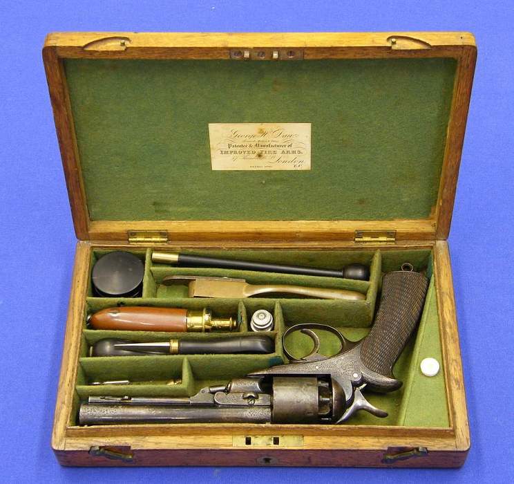 A nice cased percussionrevolver, signed George H.Daw, 57 Treadneedlest. London, cal 9 mm. length 29 cm, in very good condition. Price 4.900 euro
