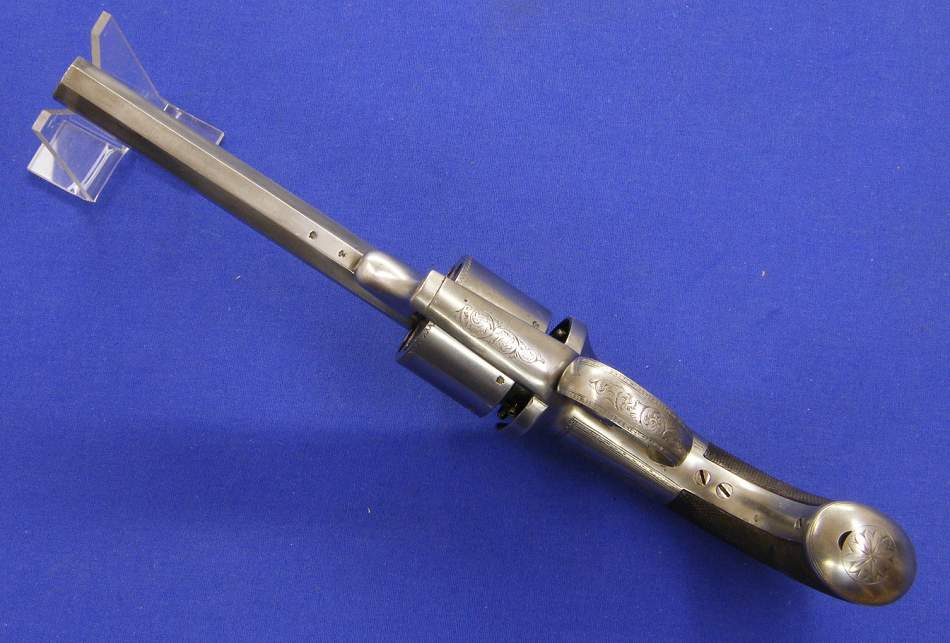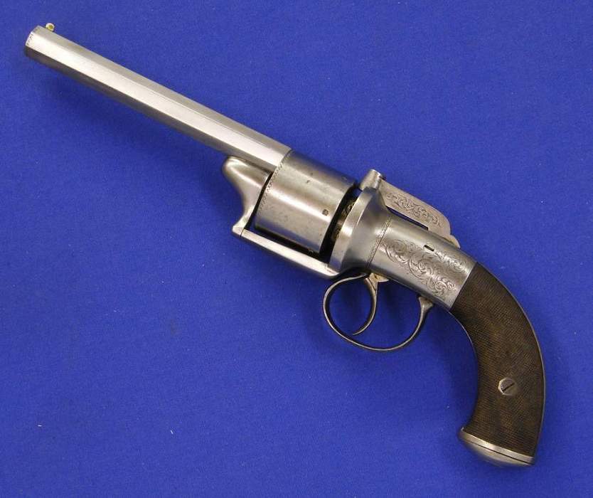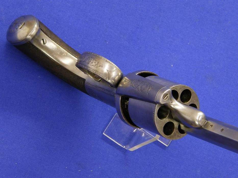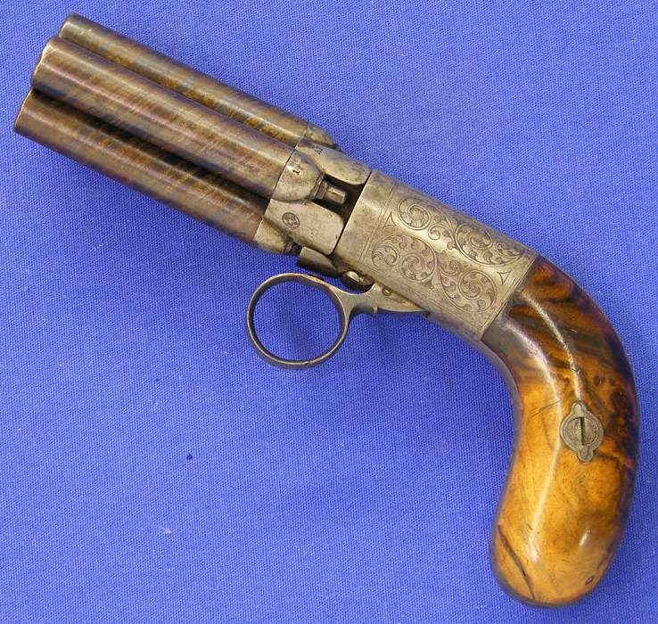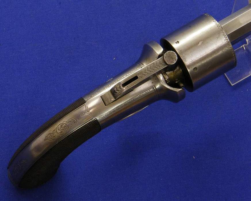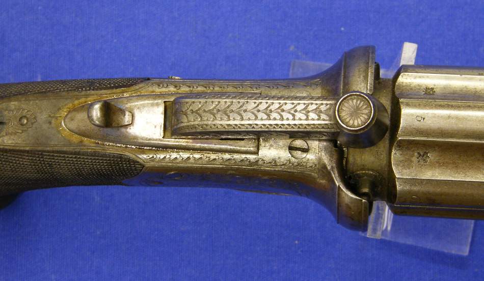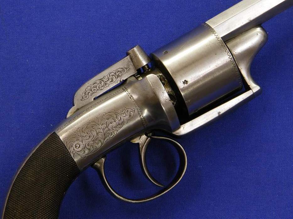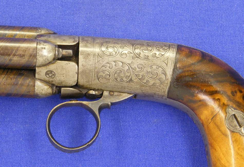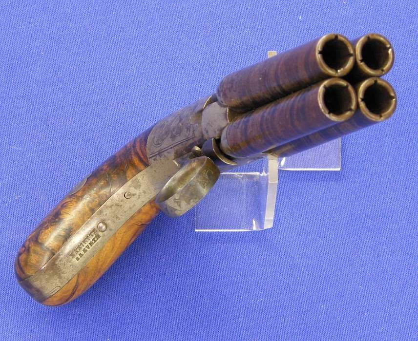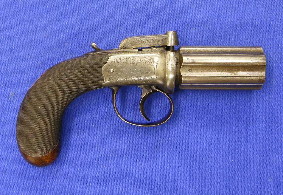 Como bien dice, es un revolver de transicion entre los pepperbox y los revolveres con el diseño actual. El pepperbox son varias recamaras que a la vez son cañon y el revolver mantiene las recamaras varias, mas cortas, y un cañon unico para todas. Como se puede apreciar en las siguientes fotos, la evolucion es clara y no total, manteniendo el revolver la posicion de las chimeneas y el percutor como el pepperbox.
