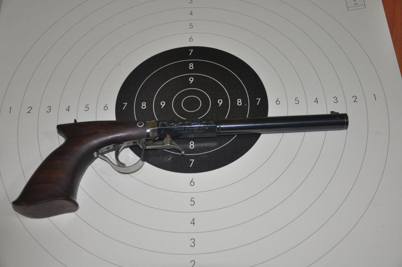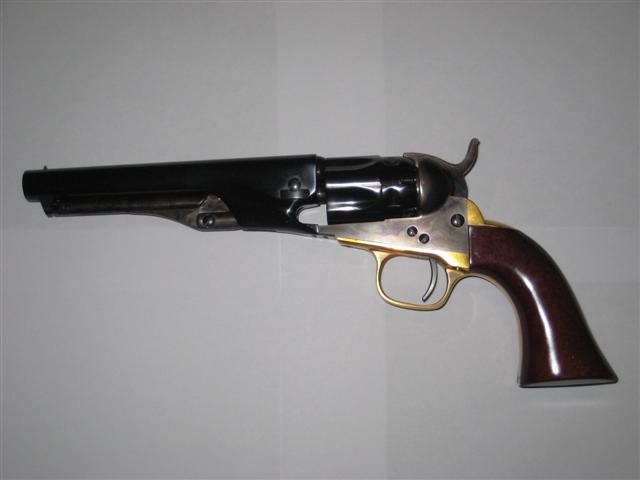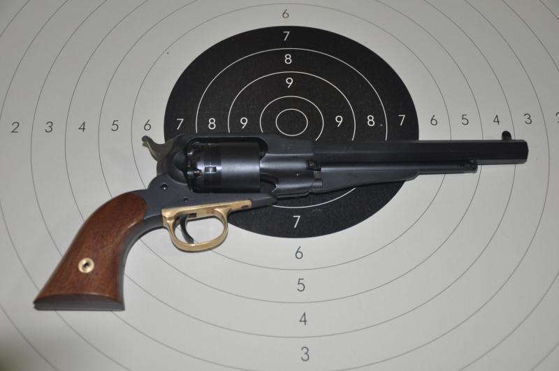 Pasemos a los revólveres los dos del 44, el primero un 1858 de la casa Pedersoli.Mecaniza estupendamente bien y tira todavía mejor, si tiro con apoyo no mete los tiros uno encima del otro sino que hace un boquete en el blanco. Lástima que el que lo empuña sea más malo que el tabaco holandes