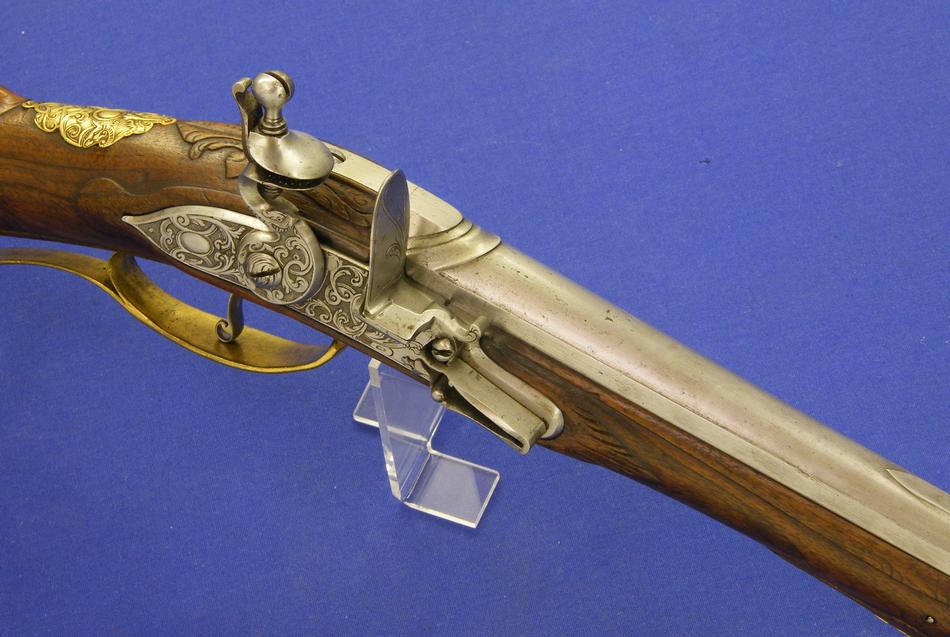A very nice probably German Flintlock Rifle, circa 1750, caliber 16 mm rifled, length 138 cm, in mint condition. Price 2.700 euro