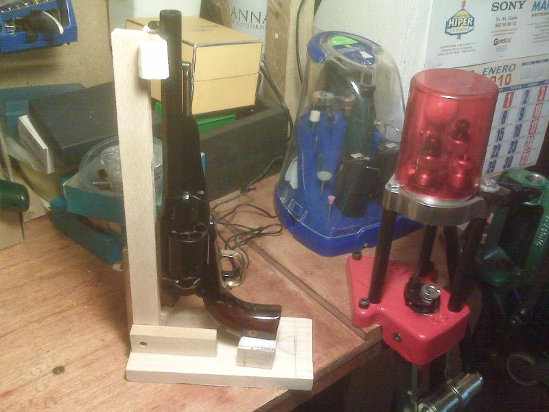 Con los restos del embalaje de un lavavajillas me he construido un soporte de carga para revolver. Es plegable y sujeta de maravilla. No precisa más explicación el mecanismo es tan sencillo como el de un botijo.