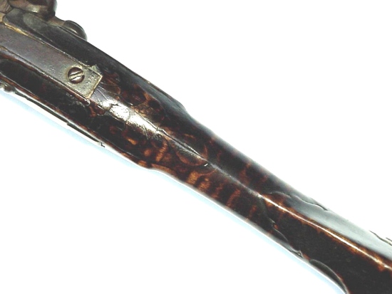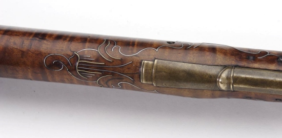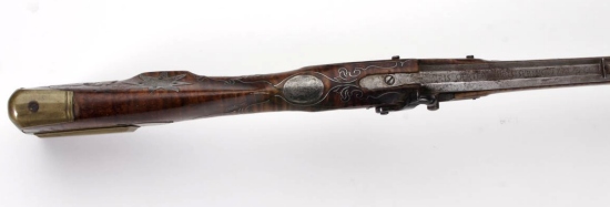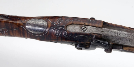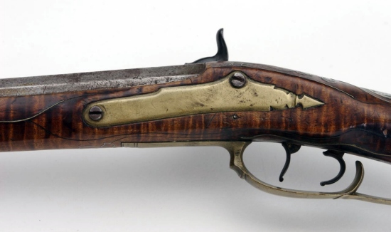 Este rifle grande es de la famosa colección de Joe Kindig, Jr., y es una de las obras más reconocidas por las manos de George Schreyer, con su forma de corazón piercing en el remate de la patchbox bien diseñado. Es rifle # 170 en "Reflexiones sobre el Rifle de Kentucky en su Edad de Oro", y todavía conserva la numeración y el código "id" tag. En su libro, los comentarios Kindig, "La talla es buena, y que incluye una de sus flores típicas de la parte trasera de la espiga barril. La población tiene una peineta muy bien definido. El grabado en la caja de los parches es algo mejor que en muchos de sus armas y hay un corazón piercing en la cabeza de la caja de revisión. En definitiva, se trata de un rifle de principios muy agradable. "