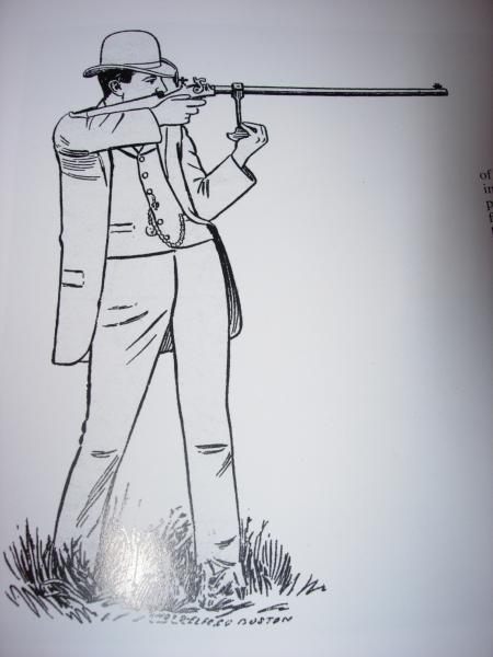El personaje que adjunto en esta ilustracion dibujo a mano ya que en la epoca la fotografia no tenia la cobertura deseada, es Mr William Hayes nacido en New Jersey, y fue uno de los mejores tiradores off-hand(tiro de pie)en Norte America.Comenzo su carrera en el tiro en 1869 en los encuentros de los club de tiro alemanes (inmigrados a EEUU), mas tarde tambien participo en Creedmoore, en competicion a largas distancias, pero se decanto finalmente, por el tiro off-hand.En 1872 adquirio un rifle de tiro de avancarga construido por el armero de origen aleman George Schalck en Pottsville que utilizaba bala conica con envoltura de papel.El utilizo este rifle desde 1872 hasta 1876 en el cual sustituyo el cañon por uno fabricado por John Rein de NY City, el cual no portaba falsa boca.En 1884 adquirio otro rifle de Schalck para tiro off-hand que es el que se adjunta en la ilustracion, con apoyo palmar(champiñon) sujeto al cañon y su calibre es de .33 con falsa boca y peso de 16 libras(aprox. 8 kg).En este rifle utilizo balas engrasadas sin taco de fieltro, peso de la bala 162 grains, con carga de 40 grains de polvora negra Hazard´s FFG.La distancia de tiro habitual estaba en 150 yardas.