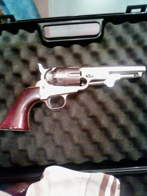 Veréis, os explico: yo ya tenía un Remington 1858 de Uberti, en calibre 36 (comprado de 2ª mano). Pero como lo compré mientras estaba esperando la AE y me hacía ilusión tenerlo y"ya" en casa, hice uso de ese artículo del Reglamento de Armas que permite tener dos armas de avancarga sin necesidad de tener licencia, aunque sin posibilidad de sacarlas del domicilio ni de disparar con ellas. Mi idea era tenerlo en casa, contemplarlo y "trastear" con él mientras mi AE estaba en trámites, cuando me la concedieran, pasarlo a la AE para disparar con él de vez en cuando...