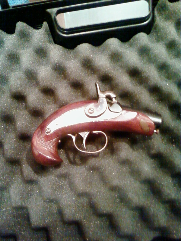 El Derringer es de la fábrica de Teodoro Arrizabalaga, de Éibar, y consta como "calibre 12mm"... he comprobado que una bola del calibre .44 parece encajarle bastante bien.