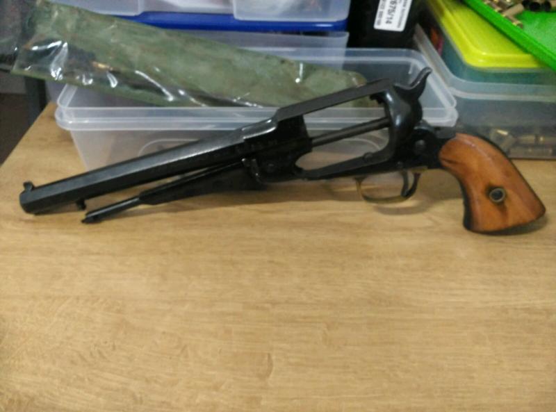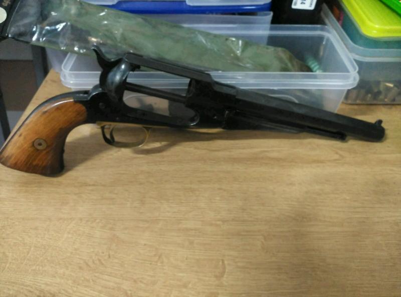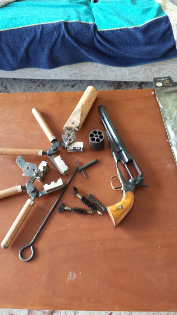 Mi padre tiene un revolver avancarga de la casa santa barbara, esta muy descuidado,es calibre 44,tiene las turquesas de punta cónica y bola,llave de sacar chimenea y poco más