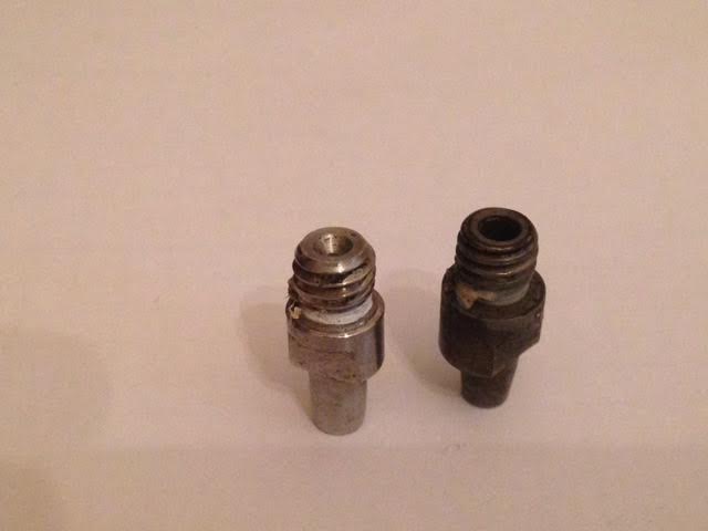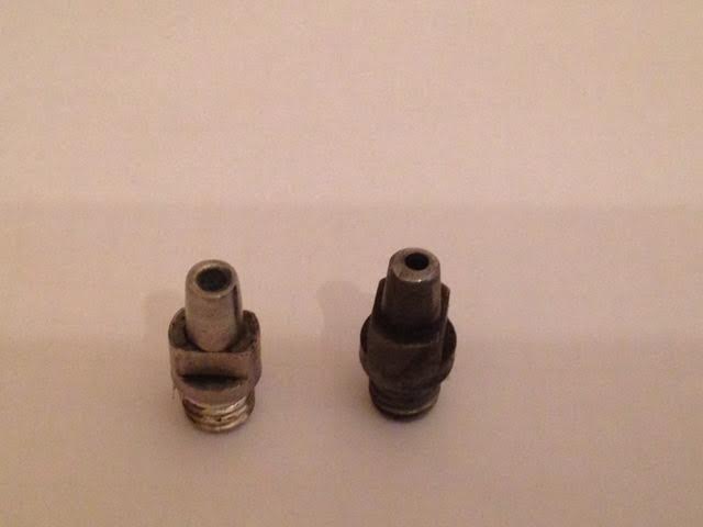 La otra es referente a las chimeneas de las dos pistolas que tengo del .45:una Dikar,y una Mendi.Como vereis en las fotos,la de acero es la de la Dikar y la otra,que creo que es de berilio,es de la Mendi;podreis observar que la de berilio es diferente,voy a ver si me puedo explicar bien,esta tiene el oido de más diametro(bastante más) que la otra,y por el contrario,tiene el canal(donde se coloca el pistón) más cerrado.