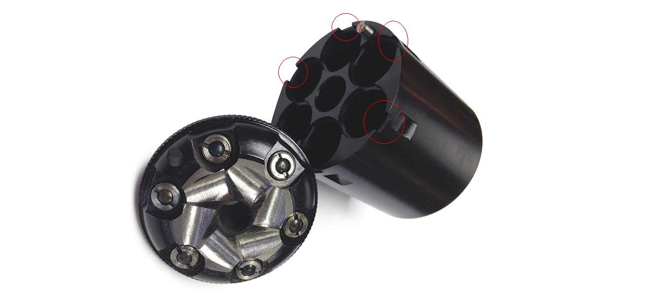 No nos olvidemos que el conversión (y todos los uberti retrocarga) es/son revolveres para el mercado americano, los cuales suelen tirar muy frecuentemente proyectiles encamisados y pólvora sin humo, por lo que uberti adapta el estriado para esta combinación (paso de estría), el conversión tiene un estriado ligeramente más profundo que el cattleman, pero sigue siendo bastante menos adecuado que el estriado de su hermano de avancarga, es decir, si le ponemos un tambor de avancarga al conversión obtendremos peores resultados que con su hermano de avancarga puro, y si disparamos pólvora negra y plomo blando tendremos los mismos problemas que con el cattleman.