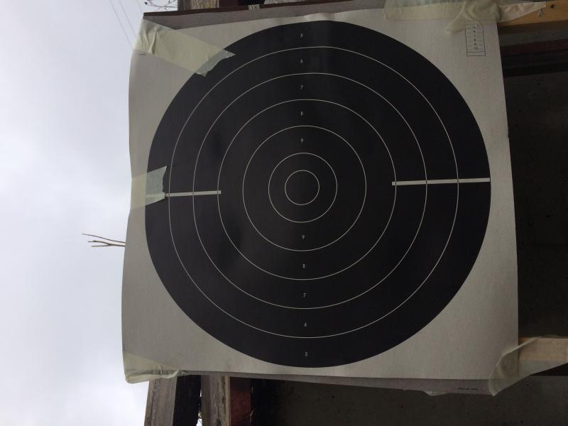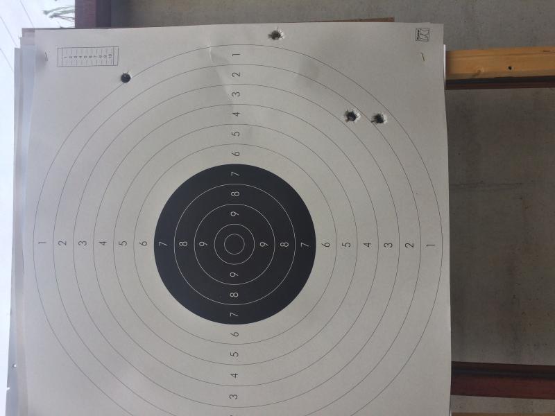 Prueba a tirar unos tiros a cincuenta metros para ver como estan encaradas las miras pues igual estan muy descentradas y por eso no le das. o pidele a alguien que observe donde van los proyectiles para tener una referencia y poder corregir. Mejor usar dianas de pistola estandar que esas de velocidad, el circulo negro mas pequeño ayuda a precisar la punteria